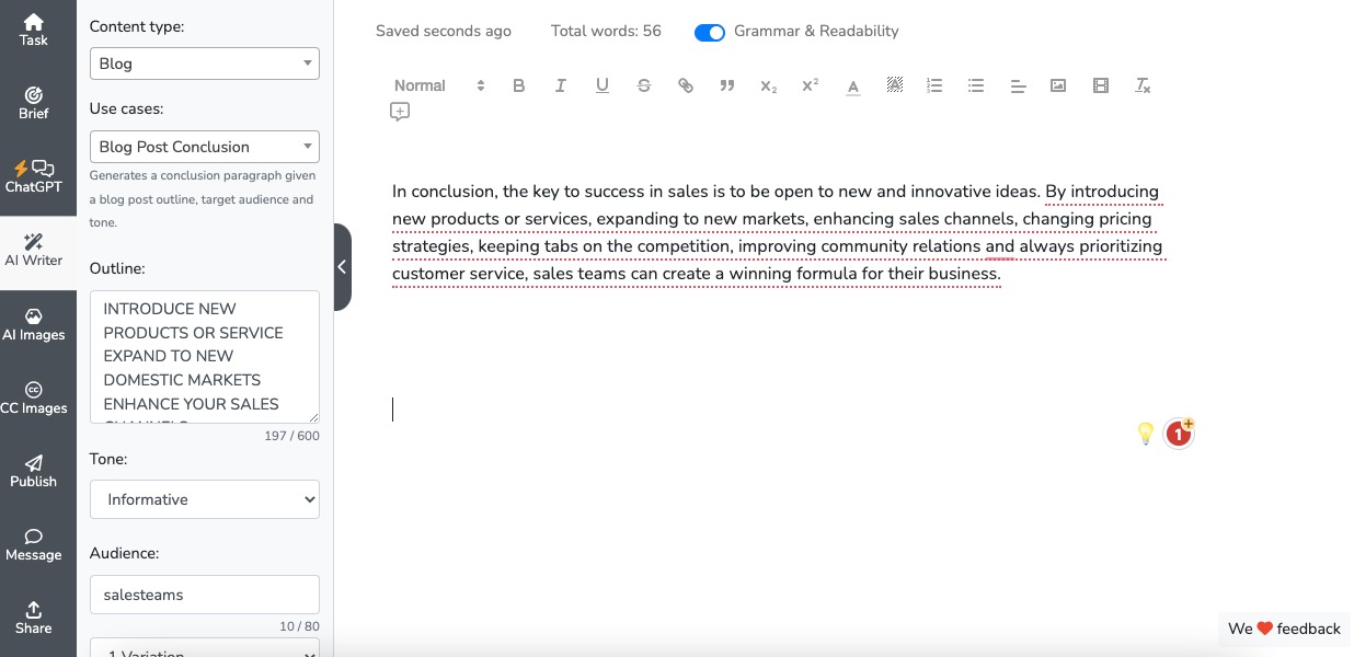 3. Usa lo scrittore di contenuti AI per elaborare i blocchi creativi
