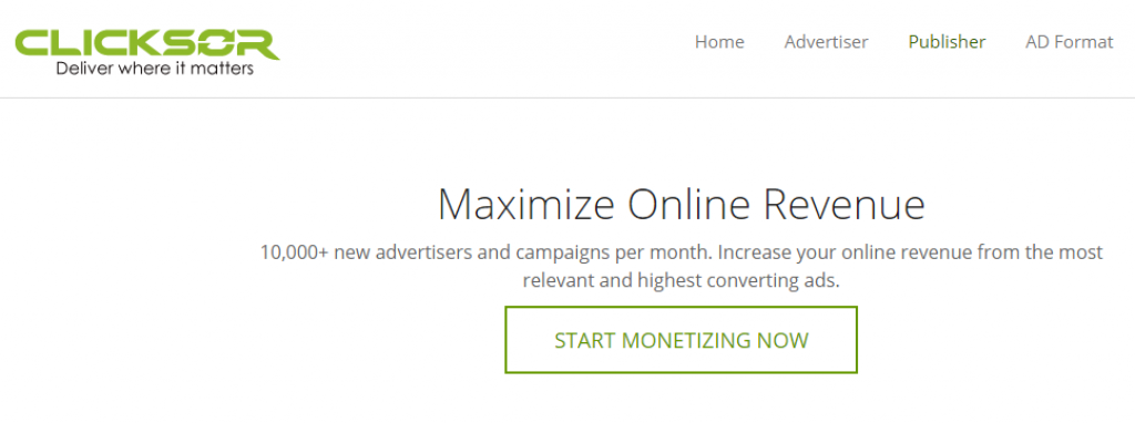 Un'altra grande rete a cui puoi unirti e generare denaro dal tuo blog e sito Web è Clicksor. Questa è una delle migliori reti pubblicitarie in più rapida crescita per i publisher che forniscono offerte CPC, CPM, CPV e CPI per guadagnare da siti Web o blog.