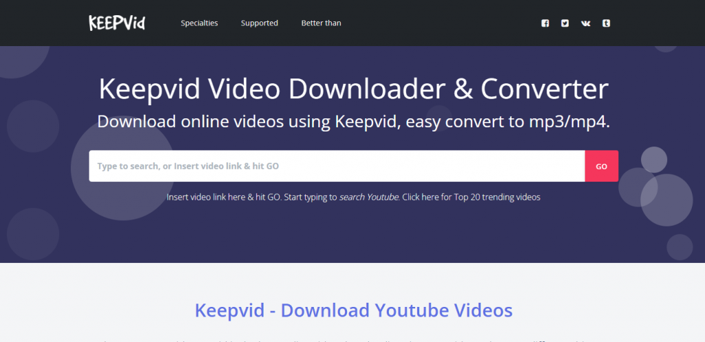 Fornisce quasi tutte le soluzioni ai problemi video che un utente deve affrontare. È una piattaforma ricca di funzionalità che funge da editor video, convertitore video, compressore video, convertitore audio e molto altro. KeepVid afferma che offrirà funzionalità più avanzate ai suoi utenti che li aiuteranno a godersi video senza interruzioni a loro scelta. Ora ha raggiunto il limite di quasi 100 milioni di utenti.