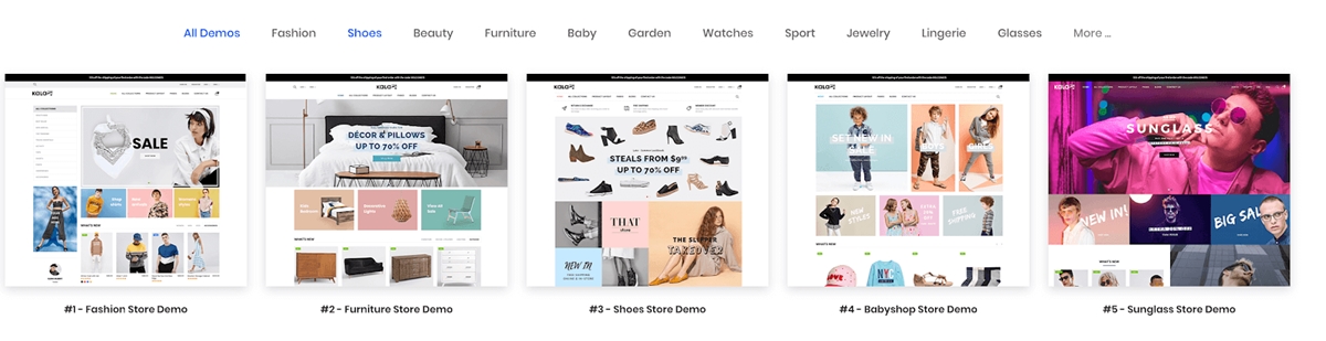 KALA fornisce anche più di 60 pagine uniche per bestseller, nuovi prodotti, prodotti in evidenza, collezioni, prodotti in offerta, prodotti per categoria, banner creativi (nuove sezioni aggiunte continuamente). Ha 9 diverse intestazioni, 5 diversi piè di pagina, 5 layout di pagina di prodotti creativi e molti stili di menu mega.