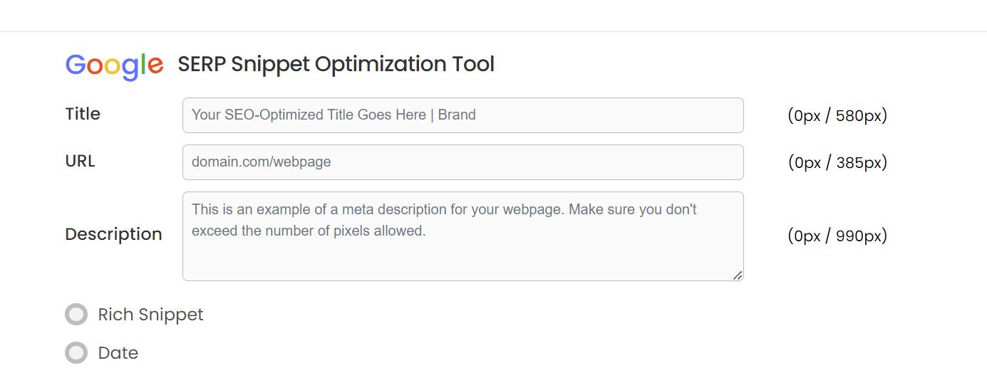 Google SERP Snippet Optimization Tool è un generatore di strumenti per snippet SERP online gratuito che simula le pagine dei risultati dei motori di ricerca (SERP) di Google e ti consente di visualizzare in anteprima e ottimizzare gli snippet SERP della tua pagina web.