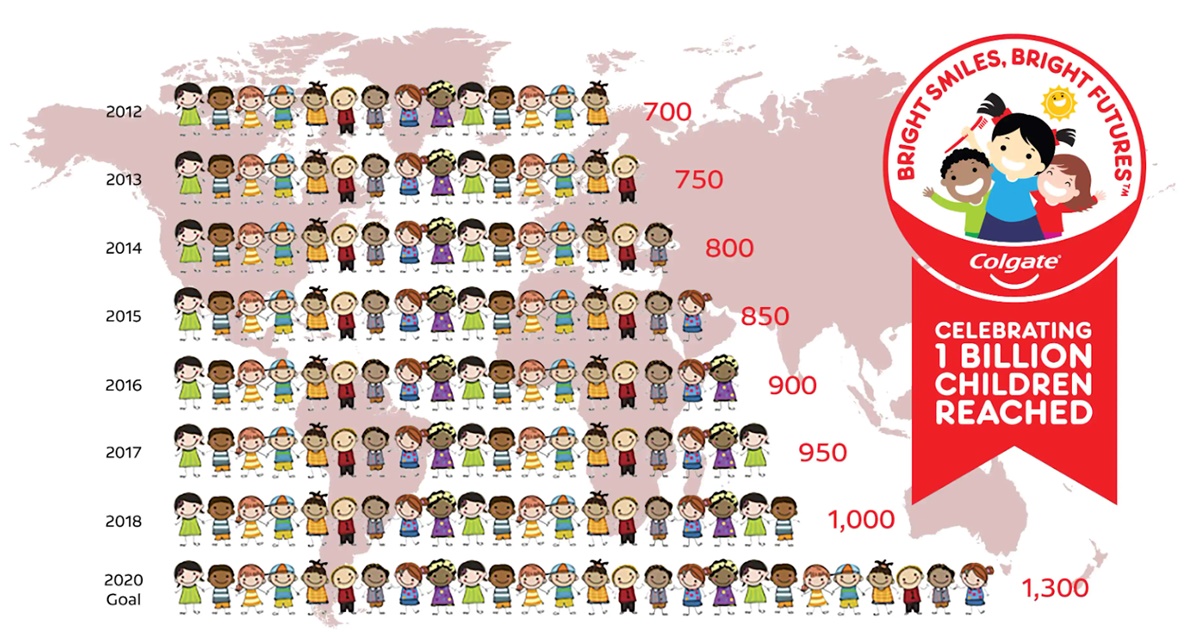 Bright Smiles, Bright Future, include materiale educativo multiculturale per i bambini per educare a mantenere sani denti e gengive. Negli Stati Uniti, Colgate ha promosso il programma con una flotta di furgoni odontoiatrici mobili che viaggiano in 50 stati del paese per fornire formazione e screening dentistici gratuiti.