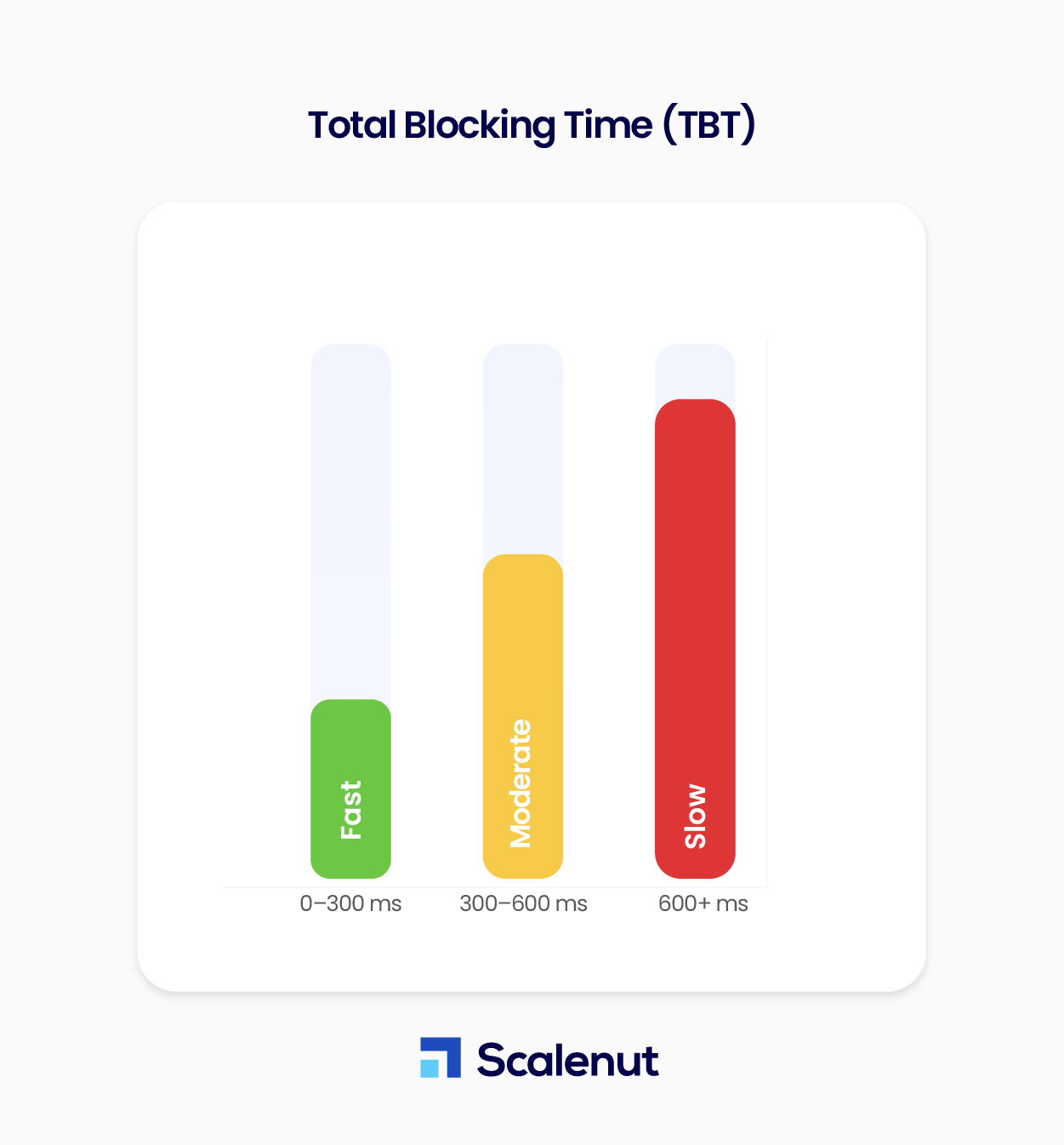 Total Blocking Time (TBT) è una metrica che consente ai gestori del sito di determinare quanto tempo impiega una pagina web per rispondere a specifici input dell'utente. Questa metrica, che viene calcolata in millisecondi e ha una gamma di punteggi TBT, rileverà le pagine con JavaScript non necessario: