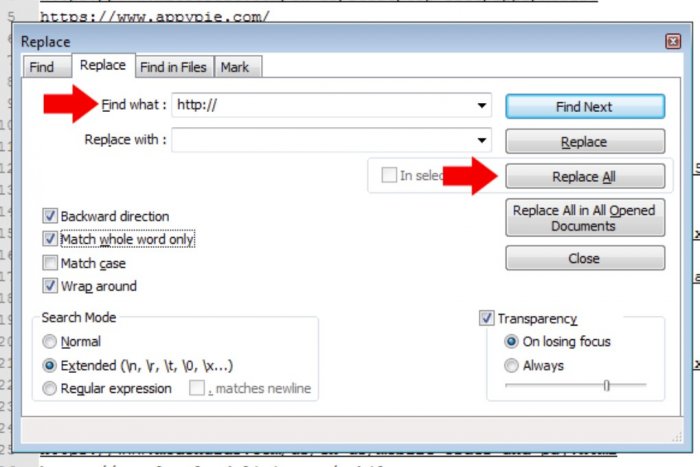 Fare clic su "Sostituisci tutto" per rimuovere tutti i protocolli "http://".