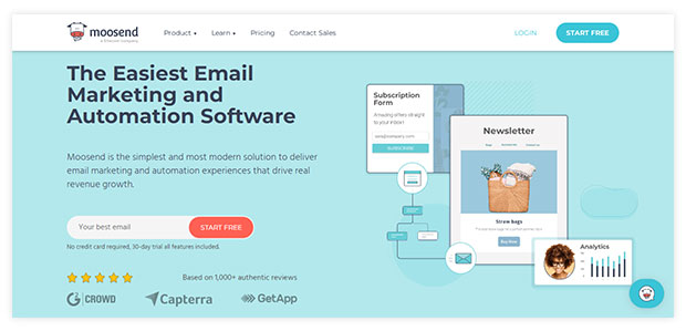 Moosend è una piattaforma di marketing all-in-one che offre costruttori di pagine di destinazione e servizi di intelligenza artificiale.