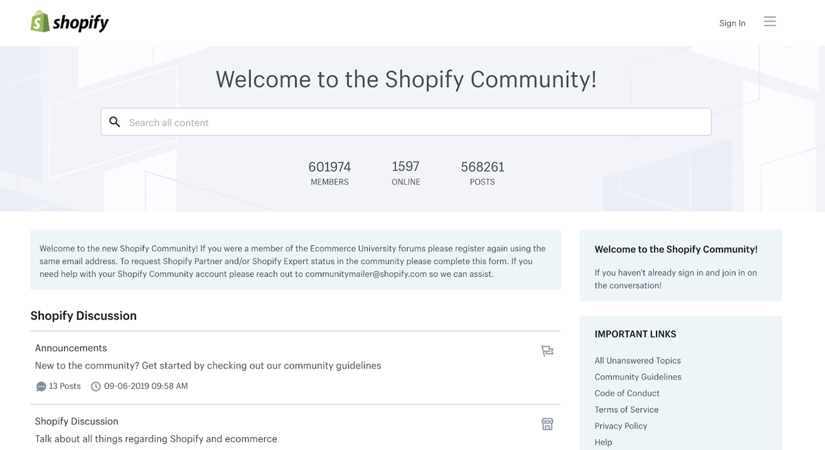 Shopify ha un forum dedicato per l'intera base di clienti per venire e discutere un'ampia gamma di argomenti che vanno dai design, alle app al marketing, alla contabilità e alle tasse. Se hai appena progettato il tuo negozio e non sei sicuro che abbia un bell'aspetto, puoi persino ricevere feedback dalla community.