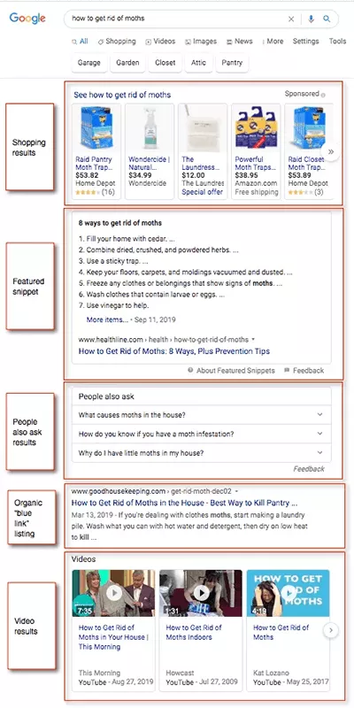 Una strategia SEO per l'intera SERP analizza le funzionalità che compaiono maggiormente nei risultati di ricerca per le parole chiave target e quindi le ottimizza. Le funzionalità possono essere qualsiasi cosa, dai video alle immagini, agli snippet in primo piano e oltre.