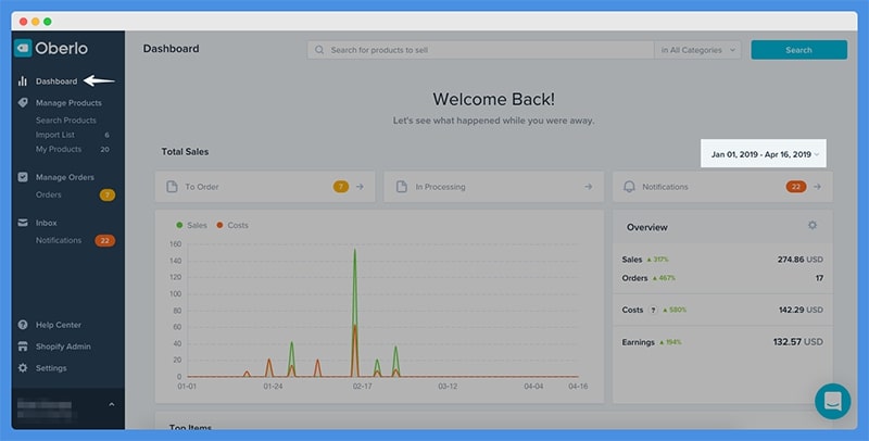 La dashboard di Oberlo ti dà accesso ai dati di vendita e alle analisi. Nell'area Panoramica è presente un grafico che mostra le vendite e i costi dei prodotti, nonché informazioni su vendite, ordini, costi e profitti in un periodo di tempo specifico. È anche possibile impostare i rapporti in modo da ricevere e-mail con i dettagli sulle tue vendite Oberlo e sulle vendite totali. Vengono forniti e inviati report giornalieri, settimanali o mensili.