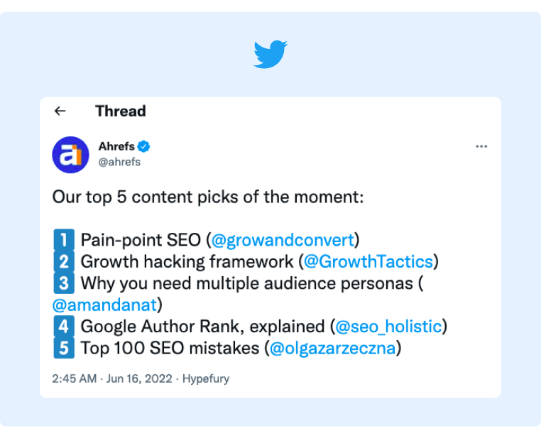 Ad esempio, Ahrefs ha recentemente pubblicato un Tweet che richiama i migliori post del blog che hanno letto di recente e poi ha taggato gli autori/marchi di quei post del blog.