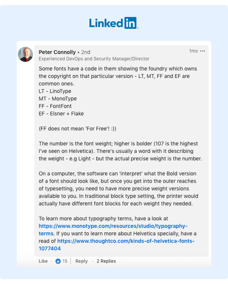Ad esempio, qualcuno in un gruppo di progettazione chiedeva informazioni su una particolare famiglia di caratteri. In risposta alla domanda, questa persona ha scritto un commento ponderato che ha risposto alla domanda: