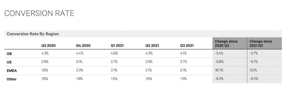 Secondo l'E-commerce Quarterly di Kibo, i tassi di conversione del terzo trimestre 2020 negli Stati Uniti si sono aggirati intorno al 2,7%. Questi numeri sono aumentati nell'ultimo trimestre, vista la stagione delle vacanze. Quindi, se il tuo CRV (tasso di conversione) è inferiore al 2%, probabilmente sei in rosso.