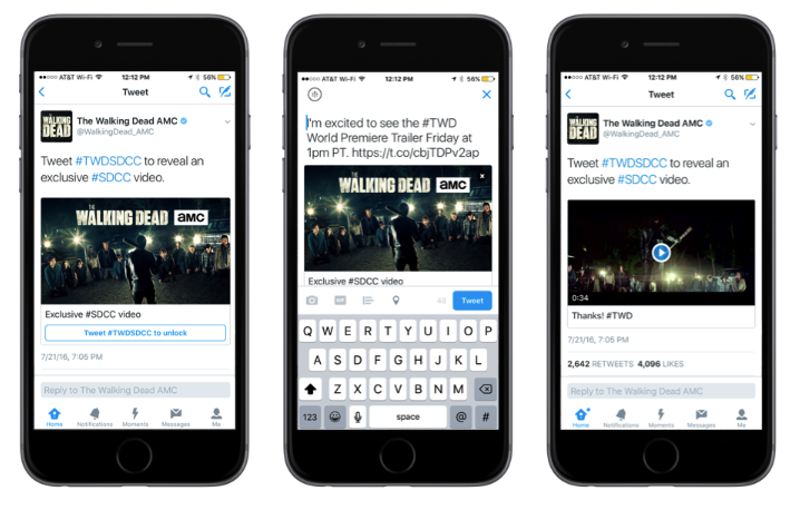 Le carte di sblocco istantaneo si basano sugli annunci di conversazione incentivando gli utenti a twittare, offrendo l'accesso a contenuti esclusivi (un trailer, domande e risposte esclusive, ricette, ecc.) dopo l'invio del Tweet: