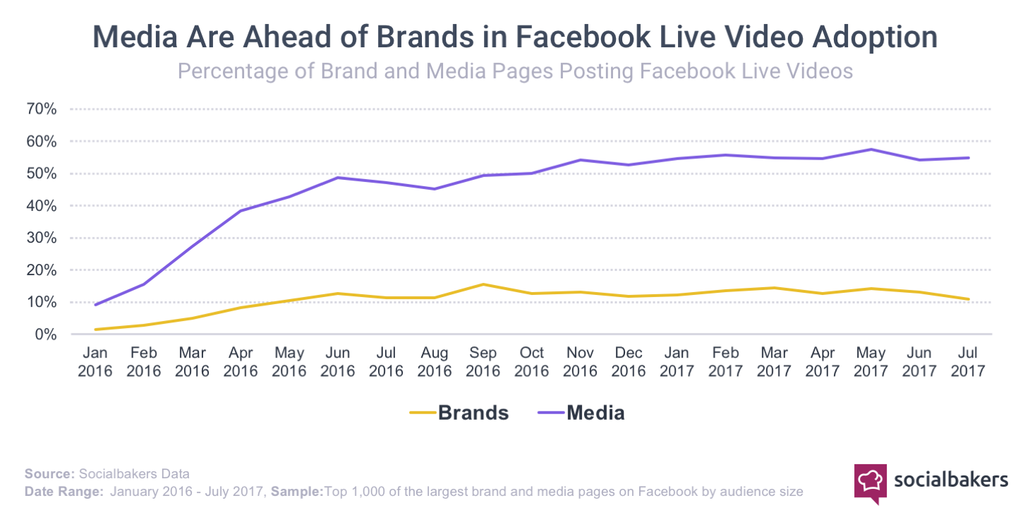 2015年8月の発売以来、ライブビデオは、特にメディア企業の場合、Facebookを席巻してきました。 メディアページは、コミュニティとリアルタイムでつながる可能性を積極的に活用しており、ライブビデオの平均採用率は46%にも達します。