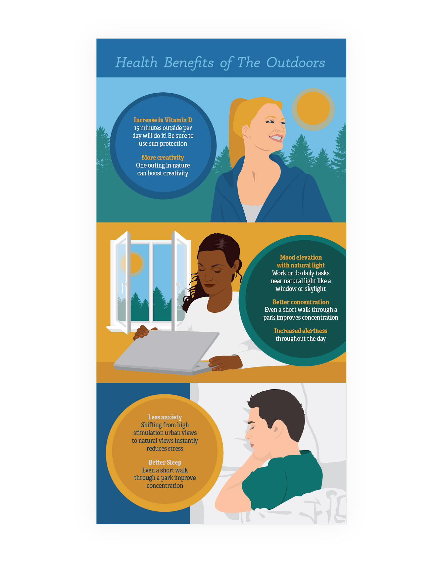 また、毎日外で過ごすように努力してください。 屋外にいると、短期記憶が改善され、創造性が刺激され、ストレスが減り、集中力が高まり、積極性が高まり、注意力が高まり、生産性が向上します。