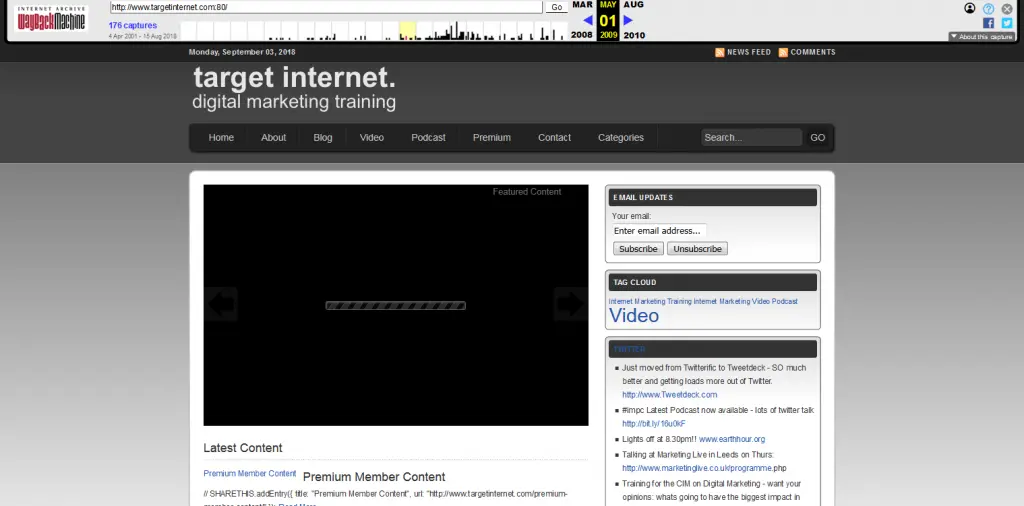 - 日時が刻印されたWebサイトの反復のアーカイブ(デジタルまたは紙)を維持することにより、Webサイトの更新の記録を保持します。 これは、コンテンツの著作権をめぐる法的紛争が発生した場合に手元に証拠があることを保証するため、良い習慣です。 また、すばらしいインターネットアーカイブ:Wayback MachineなどのWebアーカイブを介して、Webコンテンツの履歴バージョンを見つけることができる場合もあります。 このようなサービスでは、スナップショットを取得する頻度をあまり制御できないことに注意してください。 Target Internet Webサイトの2009バージョンを検索したときに、そこで見つかったものは次のとおりです。
