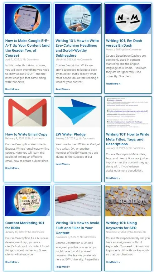 私たちはすべてのライターがスキルを磨き続けることを奨励します。 当社では、カスタムExpress Writers Universityによる広範なトレーニングと新しい学習の機会を提供しています。 ここでは、当社のライターが SEO スキルを磨き、マーケティング メールの書き方を学び、高度な文章作成原則に関する再教育コースを受講することができます。