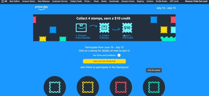 Amazon は、次の 4 つの「デジタル スタンプ」を集めた方に 10 クレジットを無料で提供します。 最初のスタンプは、Prime 対象製品を 5 ドル以上購入することを要求し、2 つ目のスタンプは、Prime Video を通じて番組をストリーミングすることを要求し、3 つ目のスタンプは、Prime Music を通じて曲をストリーミングすることを要求し、最後のスタンプは、プライムリーディングで電子書籍を借りる。 クレジットは、プライムデーや今後の Amazon での購入に使用できます。