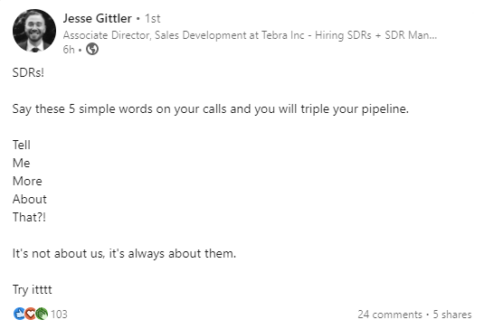 Tebra の販売開発のアソシエート ディレクターとして、Jesse は 3 人のマネージャー、4 人のチーム リーダー、ひいては 30 人以上の SDR の仕事を調整しています。 そのため、彼は SDR のトレーニング、自信の向上、日々の苦労のトラブルシューティングに豊富な経験をもたらします。 あなたが SDR である場合、または SDR を管理している場合は、彼に従ってください。