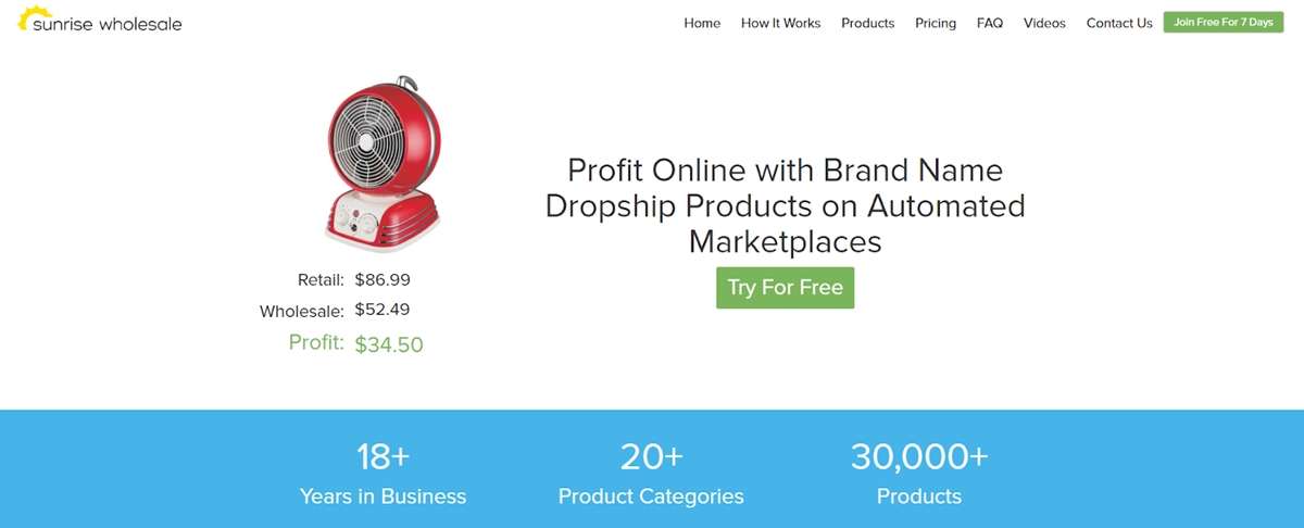 米国の卸売ドロップシッピング会社として、Sunrise Wholesaleは、ドロップシッピングを開始できるように、国内で製造された幅広い製品を提供しています。 18年以上のビジネスで、同社は多くのサプライヤーやドロップシッパーから信頼されています。