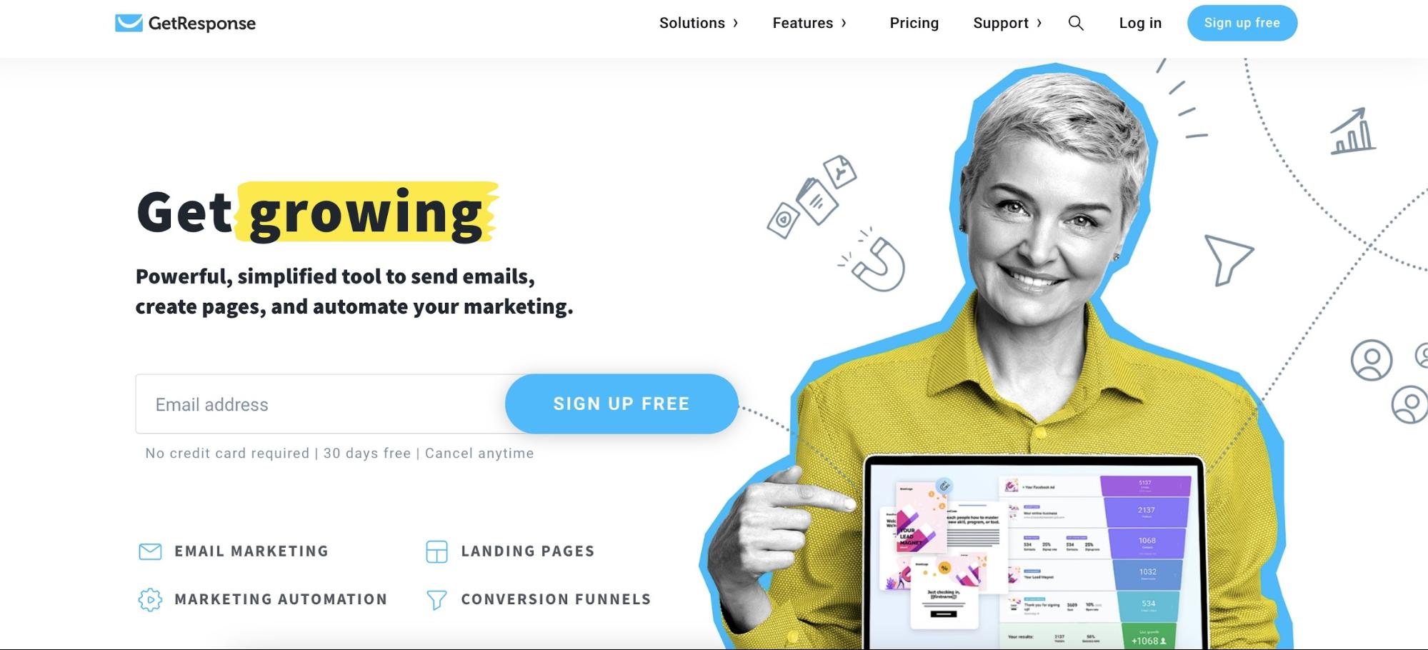 GetResponseは無料のプランを提供していませんが、キャンペーンモニターの代替手段から利用できる最高の高度な機能のいくつかを提供しています。 GetResponseは、セグメンテーションやA / Bテストなどの基本機能に加えて、販売ファネル、およびニュースレターから直接電子製品を販売する機能を提供します。 また、カスタマイズされたプロモーション用のさまざまなトリガーを備えた、最も洗練された自動化オプションのいくつかを提供します。