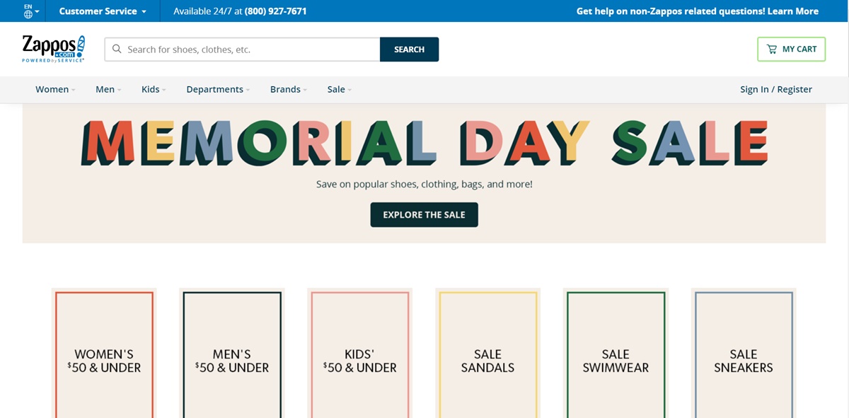 Zapposでのショッピングはとてもシンプルで簡単です。 サイトのメニューから、お気に入りのアイテムをすぐに探すことができます。 セール中の商品をお探しの場合は、セールのリンクをクリックすると、アパレル、ジュエリー、アクセサリー、靴のお得な情報が表示されます。