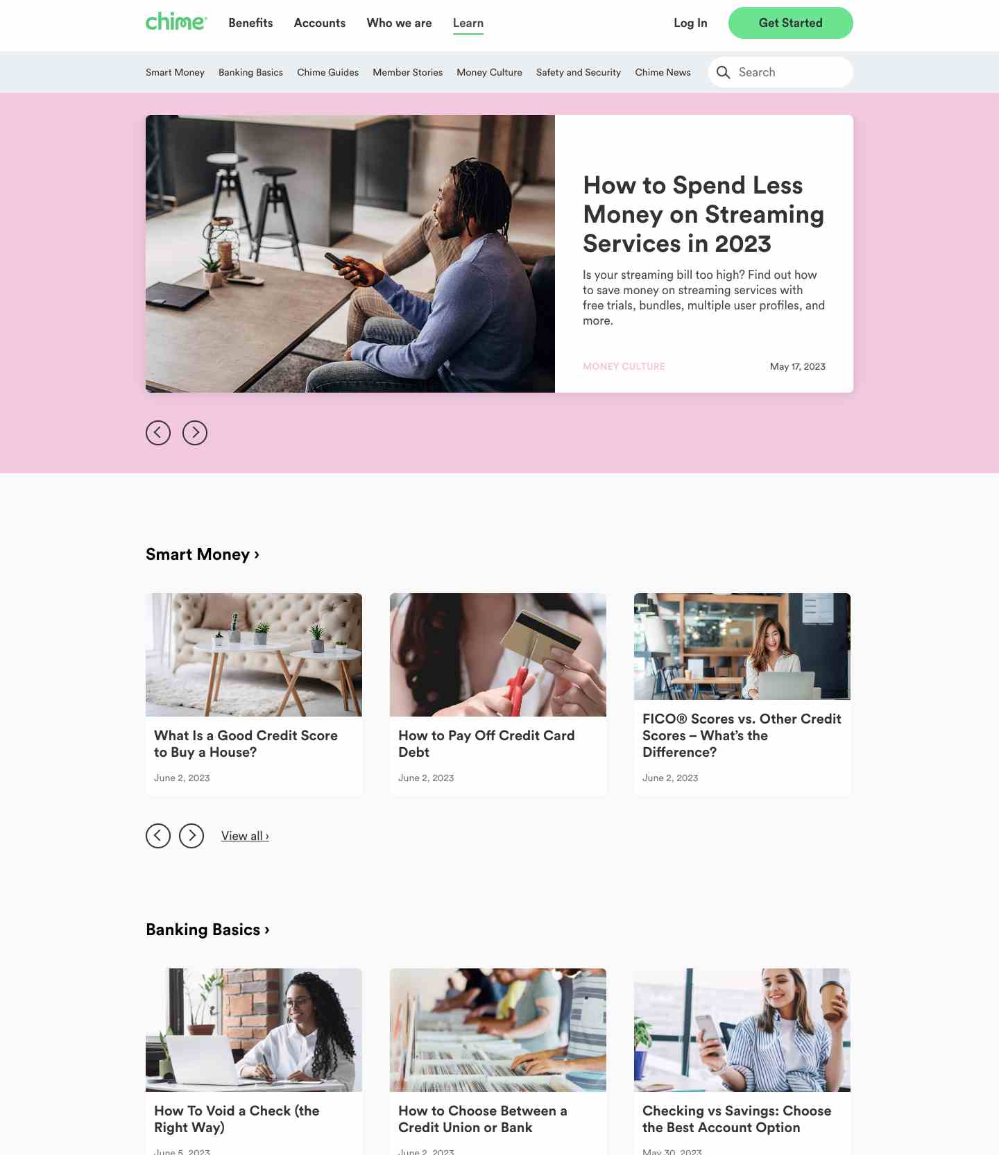 Chime のブログ コンテンツは、ブログ ページ上でいくつかの異なるカテゴリに分割されているため、ユーザーは必要な情報をすぐに見つけやすくなっています。 上部にある 7 つのブログ カテゴリすべてがリストされた簡単にアクセスできるタブを使用して、さまざまなブログ カテゴリを切り替えることができます。 また、ページには注目の投稿がすぐ上部に表示されるため、訪問者はページにアクセスするとすぐに最も価値のあるコンテンツが表示されます。