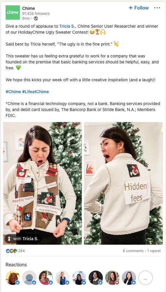 LinkedIn 上の Chime のソーシャル メディア コンテンツは少し異なります。 ブランド関連のニュース、キャンペーンの発表、および一部の教育コンテンツに重点が置かれています。 これは、ユーザーが #LifeatChime の投稿を通じて Chime の背後にいる人々について知ることができるスペースでもあります。