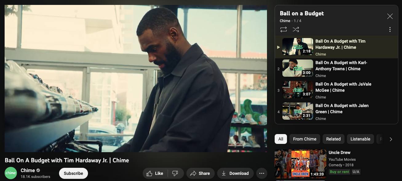 YouTubeのコンテンツ戦略も非常に興味深い。 教育コンテンツ、ブランドとのコラボレーション、プロモーション広告に加えて、Chime は「Talk Money to Me」や「Ball on a Budget」などの興味深いビデオ シリーズも開始しました。