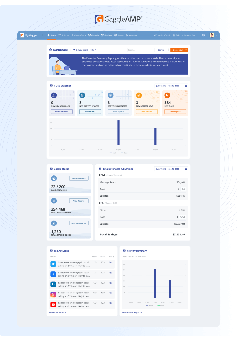 さらに、GaggleAMP は、エンゲージメントを最大化できるように、各従業員が各プラットフォームで持っている合計リーチを表示します (たとえば、最大のリーチ、社会的相互作用、および完了した活動の最大数を持つ従業員グループに活動を割り当てます)。
