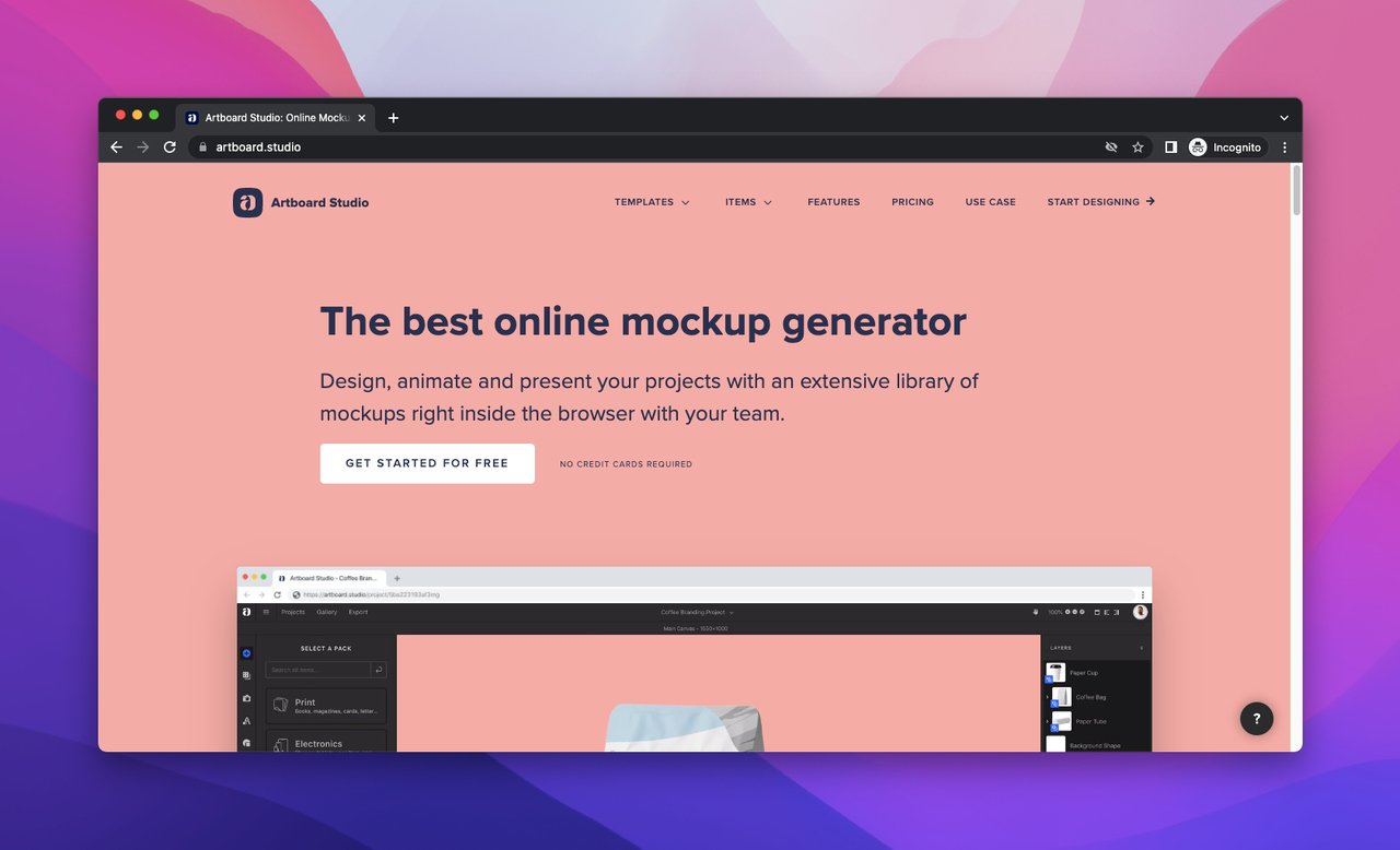Artboard Studioは、デザインプロジェクトのデザイン、アニメーション化、装飾、およびプレゼンテーションを可能にするオンラインモックアップジェネレータプラットフォームです。