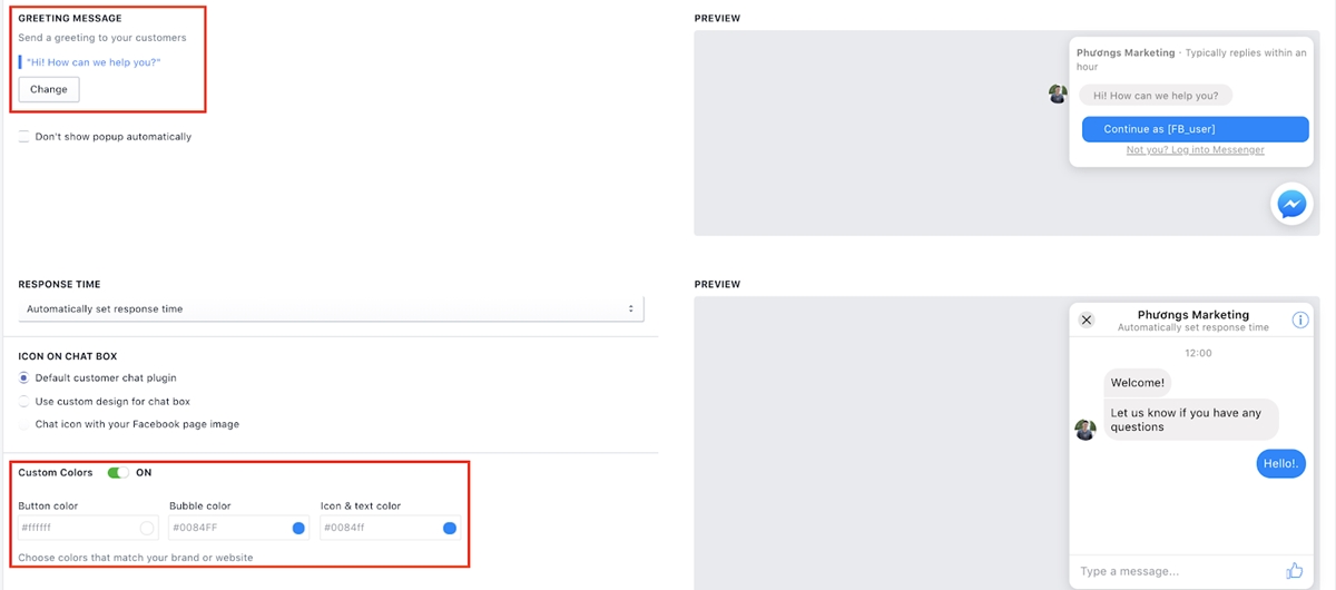 Basic Settingに移動して、グリーティングメッセージとWebサイトのメッセンジャーアイコンの色を変更し、[Save]をクリックします。