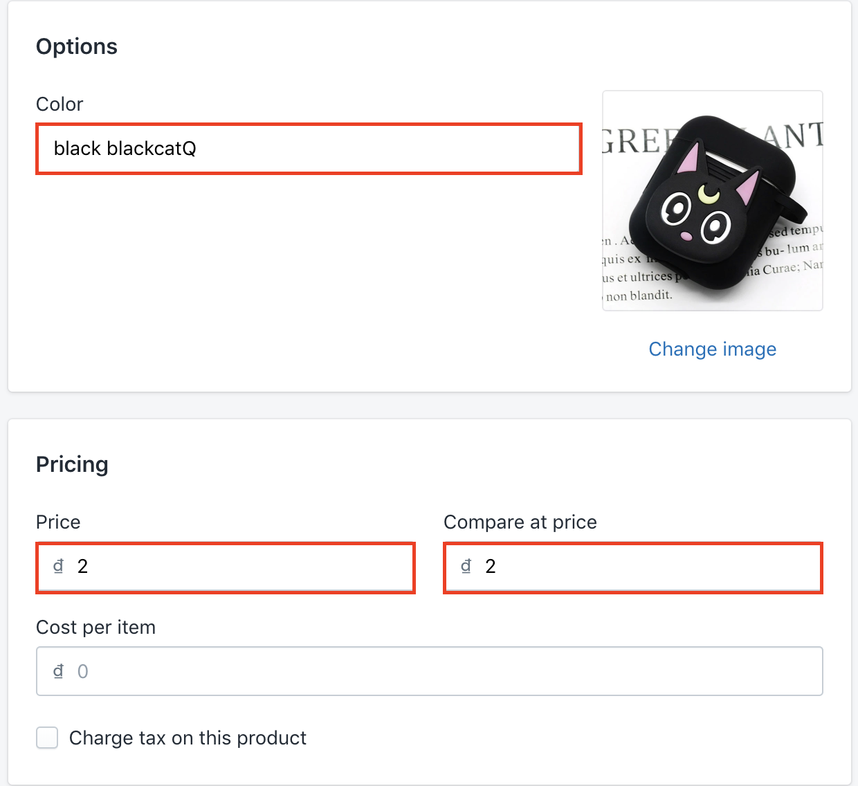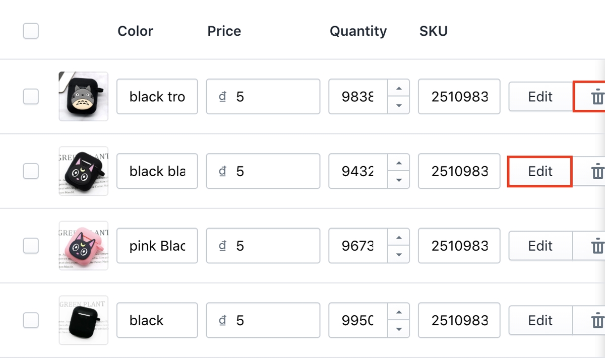 販売したくないものは、ゴミ箱のシンボルをクリックして削除してください。 販売したいものについては、[ Edit ]ボタンをクリックしてバリアント情報を変更します。