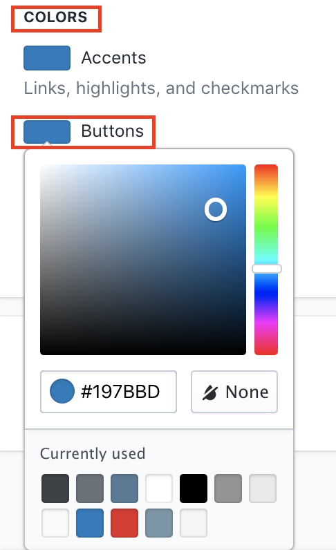 Colors]セクションまで下にスクロールし、[Buttons]をクリックして、ブランドの色を選択します。