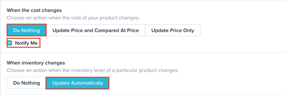 次の2つのセクションでは、[ Notify Meする]チェックボックスをオンにします。 [ When cost changesされたとき]イベントの場合は[ Do Nothingにし、[ When inventory changesイベントの場合は[ Update Automaticallyを選択します。