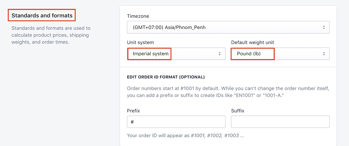 Standards and Formatsセクションまで下にスクロールします。Unit systemを「インペリアルシステム」に設定し、Default weight unitを「ポンド(lb)」に設定します。