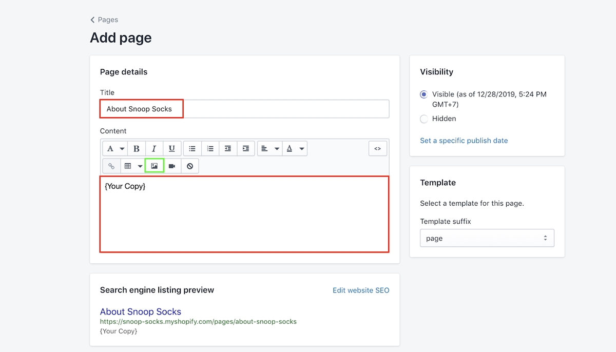 ダッシュボードのOnline Storeに移動し、[ Pages ]をクリックします。 次に、[ Add page ]をクリックします。