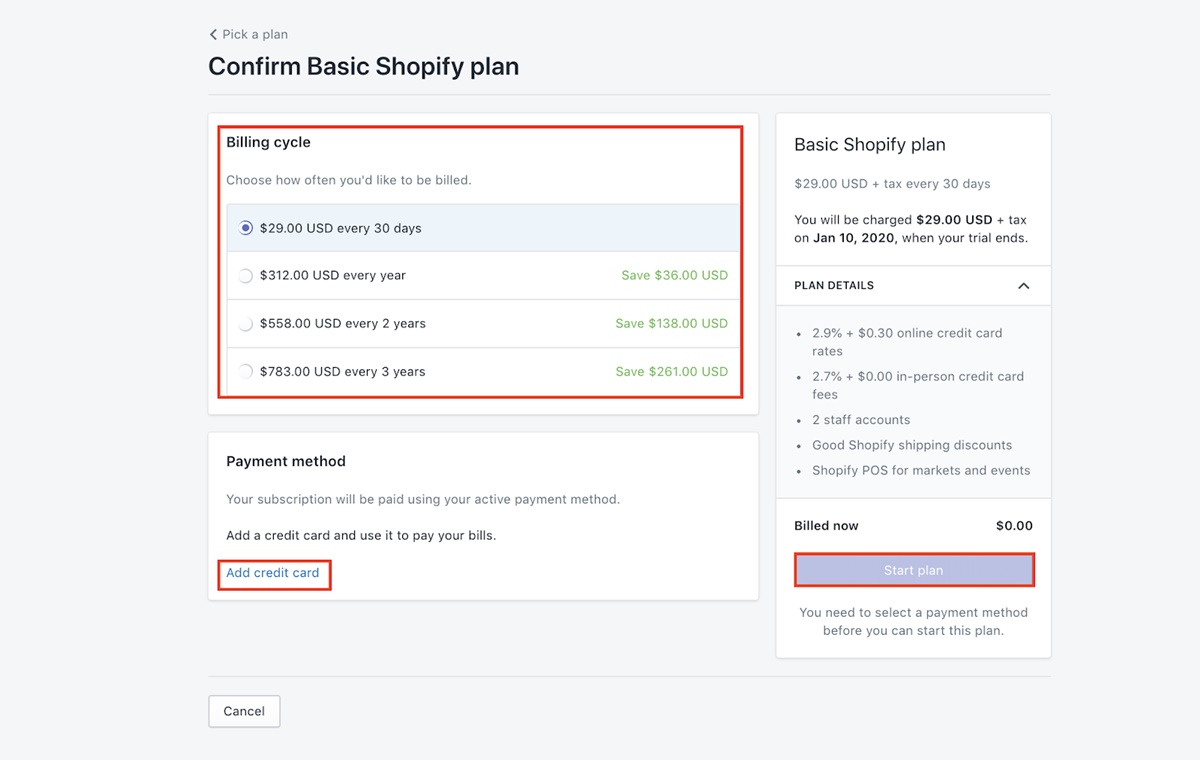 Shopifyを14日間無料で試すことができますが、その後、ドロップシッピングビジネスを構築するには、少なくとも月額29ドルの基本プランを支払う必要があります。