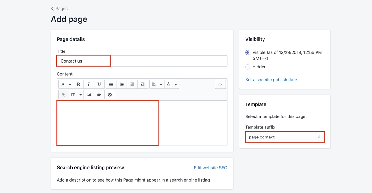 [ Template ]セクションで、ドロップダウンリストから[ page.contactを選択します。 次に、[ Save ]をクリックします。