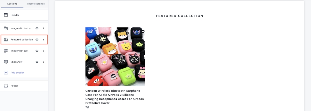 Sectionsに戻り、[ Featured collection ]をクリックして、表示するコレクションを選択/変更します。