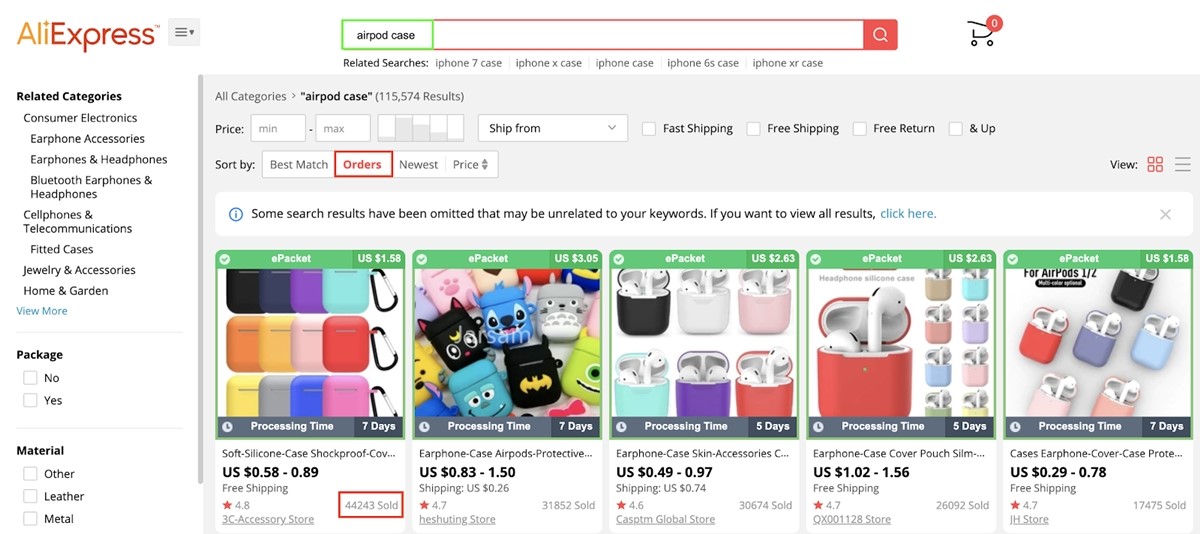 - あなたがあなたの店に輸入したい製品の名前をAliexpressで検索してください。 最も売れている商品が最初に表示されるように、必ず