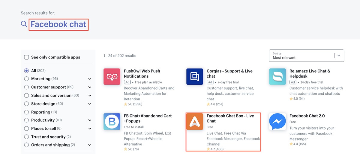 - 「Facebookチャット」を検索し、「Facebookチャットボックス-ライブチャット」を選択します。