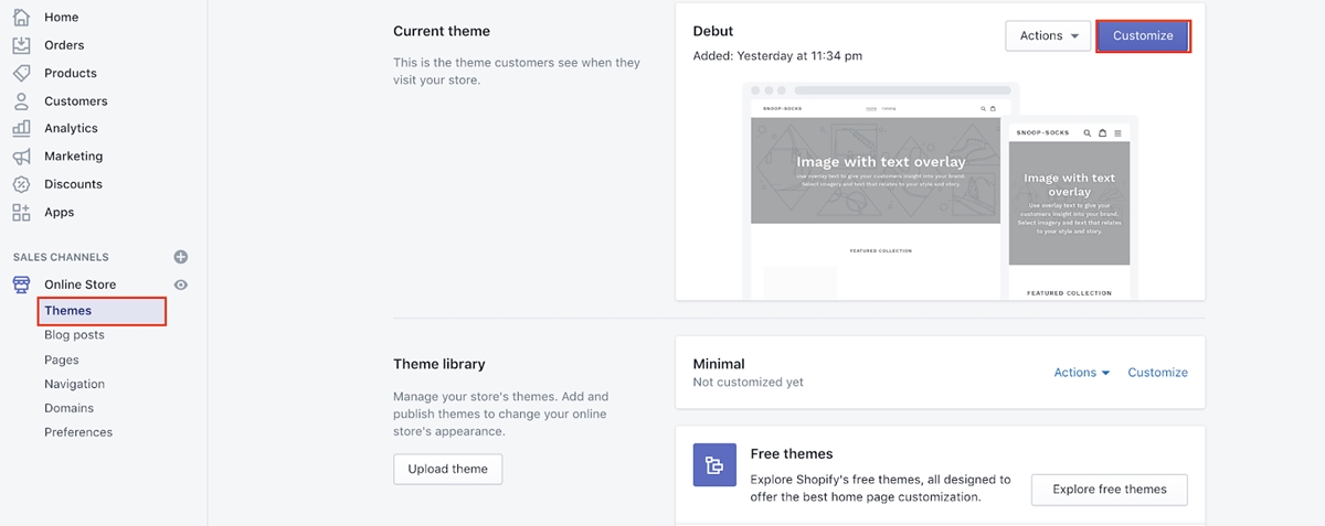 Online store]をクリックします。 次に、[Themes]に移動し、[Customize]ボタンをクリックします。