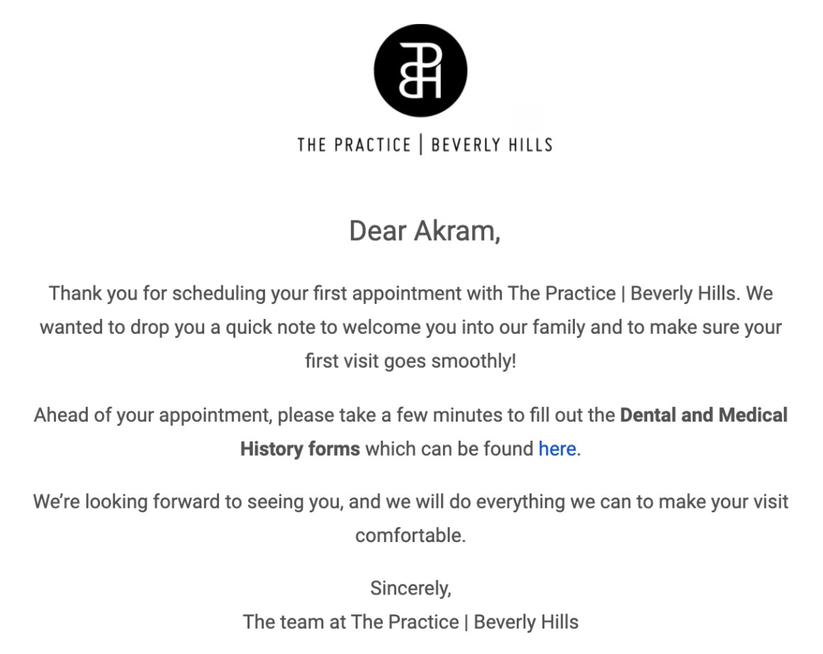 ThePracticeの例| 以下のビバリーヒルズは、予約された予約を確認し、事前に歯科および病歴フォームに記入するよう患者に依頼するためのリンクを共有しています。