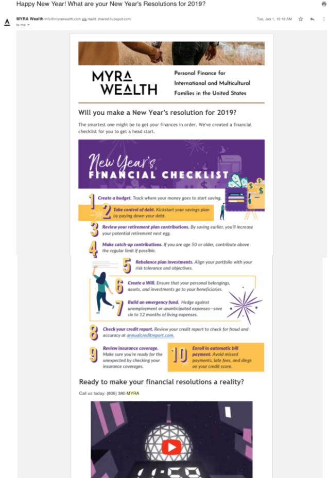 MyraWealthからのこの新年のメールキャンペーンを見てみましょう。 上記のリストのほぼすべての要素に当てはまります。