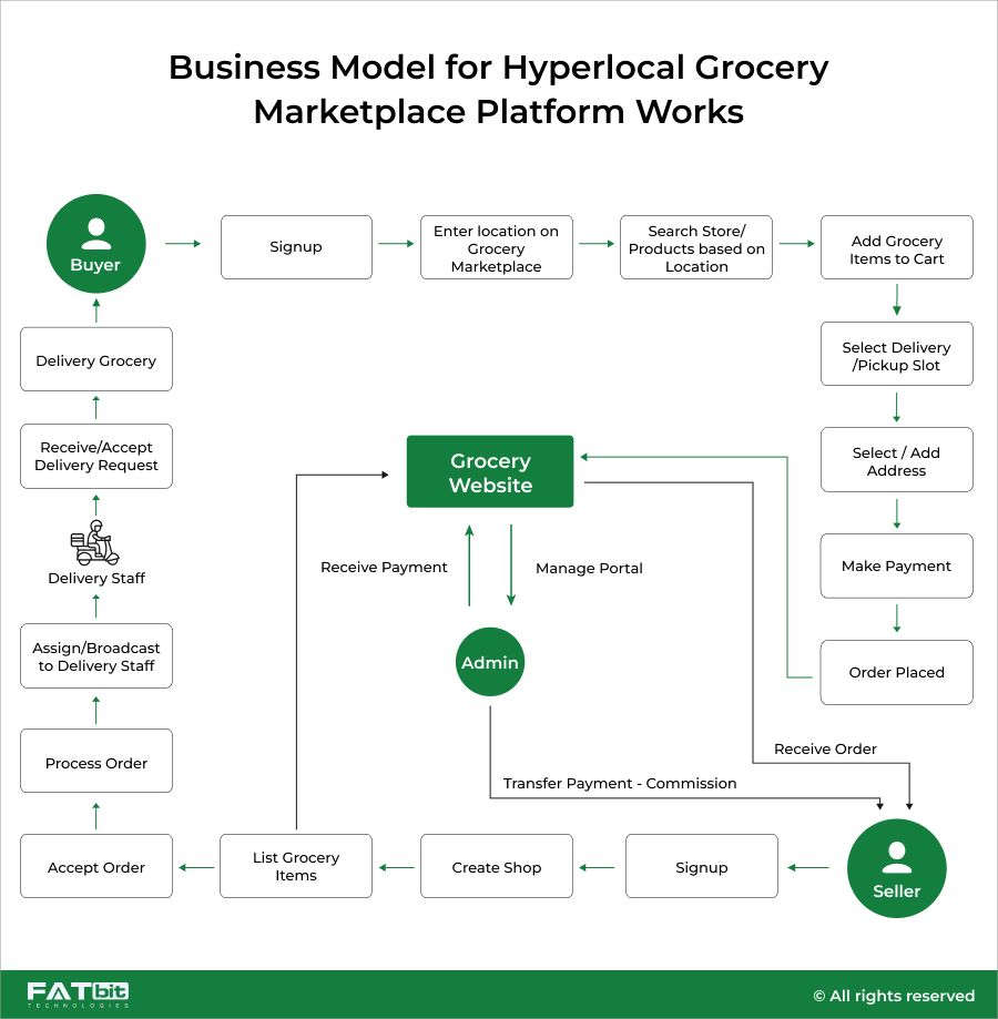 オンラインのハイパーローカル食料品市場のトッププレーヤーを調査したので、eコマースのハイパーローカルモデルがどのように機能するかを理解することが重要です。 他のオンライン プラットフォームと同様に、ハイパーローカル マーケットプレイスには管理者、販売者、購入者、配達担当者がいます。