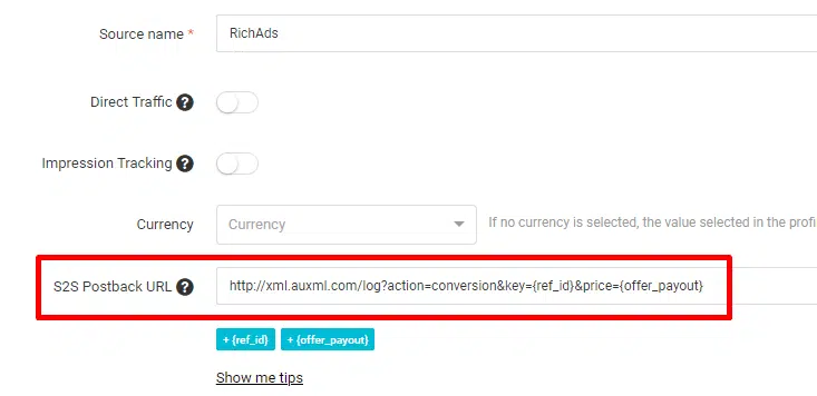変換URLをコピーしてから、Redtrackに移動し、[Traffic Sources]タブから[RichAds]を選択して、[S2SPostbackURL]ボックスにリンクを貼り付ける必要があります。