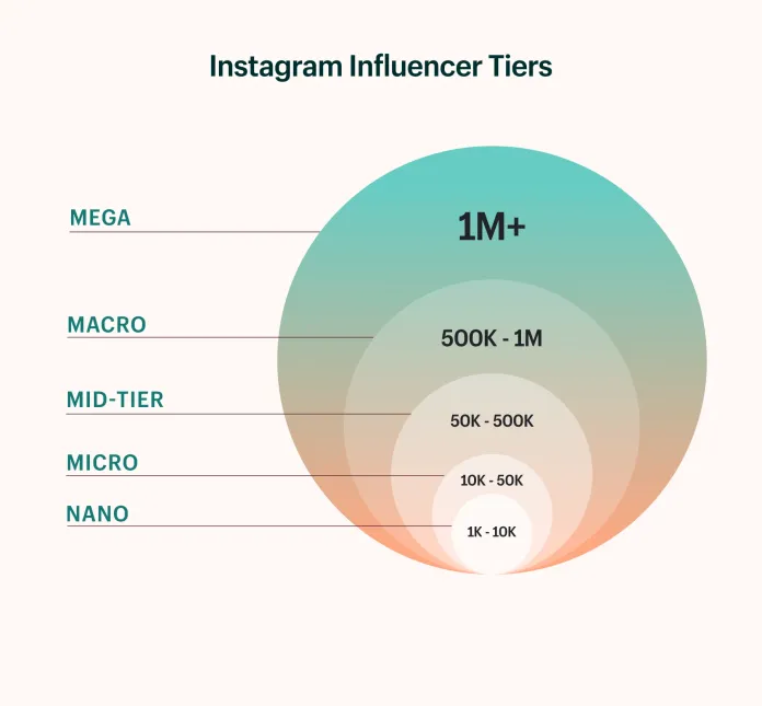 マーケティング担当者は、インスタグラムのインフルエンサーを、ナノ、マイクロマクロ、ミディ、メガの 5 つのカテゴリーに分類しています。 これは、フォロワー数に分割される方法です。