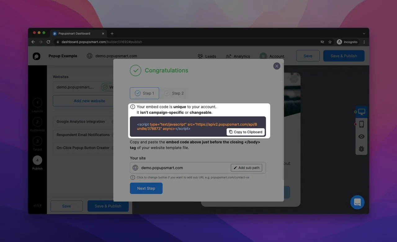 6番目のステップ: 「公開」の部分では、以下に示すように、ポップアップの埋め込みコードをコピーできます。 ポップアップがエラーなしで機能するように、ドメインを確認することを忘れないでください。 次に、このコードをWebサイトのコードインジェクション部分に貼り付けます。