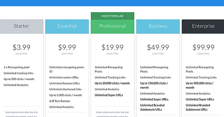 • エッセンシャル – $9.99 ユーザー/月このプランには、最大 5000 クリック/月、A/B テスト ローテーター、無制限のリターゲティング ピクセル、カスタム URL、Amazon URL、短縮リンク、分析が含まれます。