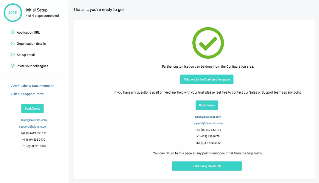 アプリ内オンボーディングを開始すると、明確な視覚的な「初期設定」モーダルに移動しました。 チェックリストとプログレスバーを使用すると、セットアップがどの程度進んでいるかを簡単に確認でき、退屈な詳細を入力するのが少し楽しくなります。 また、このウィンドウからカスタマーサクセスチームと簡単に連絡できるようになっていることも気に入っています。 よくできました、HaloITSM!